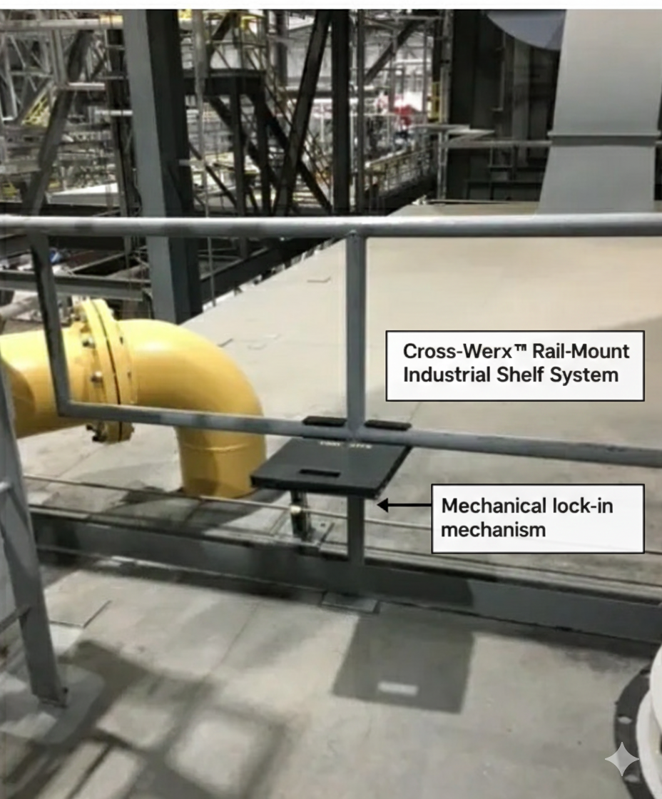 This demonstration shows Cross-Werx being installed directly onto existing rails to create strong, modular shelving in real industrial environments. The system locks securely into place, allowing shelves to be mounted quickly using standard materials for customized setups.